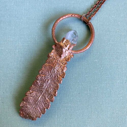 Pendant measures roughly 1.5″ high by 3.5″ wide and includes a 30” antiqued copper chain. If you’d like a different chain length, leave me a note at checkout — chain can go up to 32”. Chain styles and closures may vary.